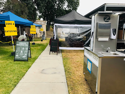Lunch time was staggered, like French hours: each of us peeled off when we could, then took a half hour to eat. but then the whole company broke for a half, with a catered lunch from one of the regular motion picture catering companies that set up under a pop-up tent in the parking lot, with a sheet of clear vinyl in front. You walk up to a little window with the menu, pick what you want, and they box it up, like ordering from a roach coach. Drinks are all pre-packaged. At lunch, everybody was extremely excited to talk to strangers.